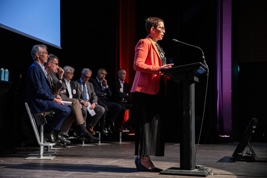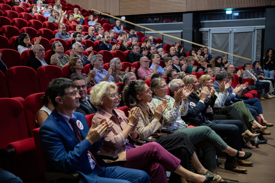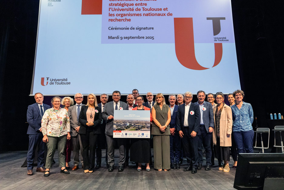 De gauche à droite : Jean-pierre Delord, Directeur général de l’Oncopole Claudius Regaud ; Dominique Poquillon, Présidente de Toulouse INP ; Marie-Hélène Baroux, Directrice générale de l’ISAE-SUPAERO ; Philippe Charvis, Directeur délégue à la science de l’IRD ; Nadia Pellefigue, Vice-Présidente de la Région Occitanie en charge de l’enseignement supérieur, la recherche, des affaires européennes et internationales ; Riad Haidar, Directeur scientifique général de l’ONERA ; Didier Samuel, Président-directeur général de l’Inserm ; Antoine Petit, Président-directeur général du CNRS ; François Jacq, Président-directeur général du CNES ; Odile Rauzy, Présidente de l’Université de Toulouse ; Éric Latgé, Directeur Général de l’École d’ingénieurs de Purpan ; Véronique Dominguez-Guillaume, rectrice déléguée pour l’enseignement supérieur, la recherche et l’innovation de la région académique Occitanie ; Alain Soulan, Directeur général adjoint de Météo-France ; Damien Trémeau-Busson, Directeur de l’ENSFEA ; Pierre-Benoit Joly, Président du centre Occitanie-Toulouse, Délégué régional Occitanie d’INRAE ; Michael Toplis, Président de la Communauté d’universités et établissements de Toulouse ; Pierre Sans, Directeur de l’ENVT ; Emmanuelle Garnier, Présidente de l’Université Toulouse - Jean Jaurès ; Justine Koob, Directrice de la recherche du CHU de Toulouse ; Christelle Farenc, Directrice de l’INU Champollion.