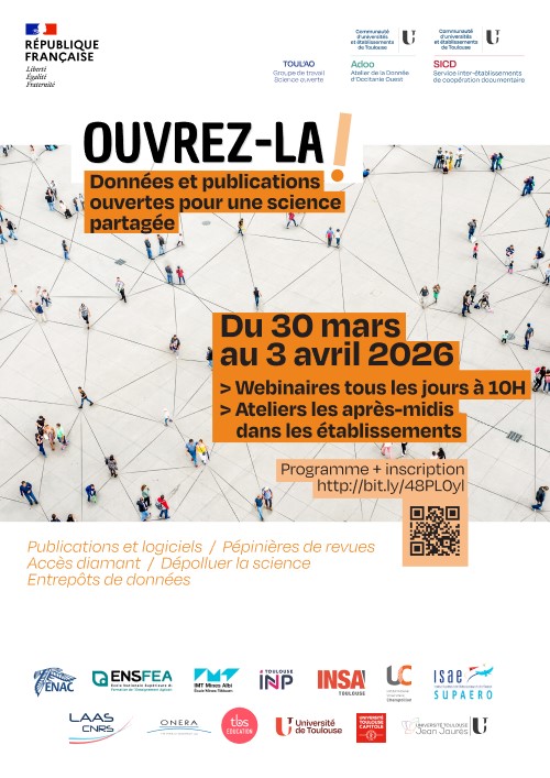 Du lundi 30 mars au vendredi 3 avril 2026,  le groupe de travail du réseau des bibliothèques de Toulouse-Albi (Toul'AO) et l'Atelier de la donnée Occitanie Ouest (ADOO) vous invitent à une semaine d'échanges et de découvertes autour des données et publications ouvertes.